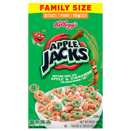 Start your day with Kellogg's Apple Jacks breakfast cereal and the crunch of delicious O's with the flavor of crisp apples and cinnamon. A low-fat breakfast cereal, Kellogg's Apple Jacks is a good source of 8 vitamins and minerals. Not just for breakfast, Kellogg's Apple Jacks is a tasty and nutritious addition to any meal or snack any time of the day; Enjoy as a snack at the office, take in an afternoon pick-me-up, reenergize with a post-workout treat, and indulge in a late-night bowlful of sweet, crunchy breakfast cereal with sweet cereal milk. Kellogg's Apple Jacks also makes a scrumptious addition to your favorite yogurt and is a great base for homemade trail mix, the mouthwatering options are endless. A travel-ready food, this breakfast cereal is perfect to pack for school lunch, enjoy as an after-school snack, bring along to sporting events, or indulge in during busy, on-the-go moments. Just add your favorite dairy or nut milk and enjoy as a quick breakfast.