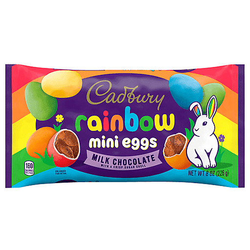 Hop into deliciousness with these delectable milk chocolate candies covered in crisp sugar shells! The search for the perfect Easter candy is over. CADBURY MINI EGGS milk chocolate candy is a treat you'll want to enjoy throughout the season. These milk chocolate candy eggs are coated with crisp sugar shells finished in bright rainbow colors, making them the perfect addition to Easter baskets, candy bowls and seasonal decor. They make it easy to fill lunch boxes, snack cabinets and movie night snack selections with yummy brightly colored candy everyone will love. Fill your Easter baskets with these milk chocolate candies to treat yourself and those closest to you with a delectable crunchy, smooth candy. Preparing for an Easter egg hunt? Offer up a bag of CADBURY MINI EGGS candies for the winner! No one involved in the hunt will want to stop searching once they find out what the delicious prize is. If you want to mix it up even more this spring, try giving your favorite brownies, cupcakes, cookies or pies a bit of a crunch by topping them with these colorful chocolate egg-shaped candies. Let cool, serve to loved ones and wait for the recipe requests to pour in!