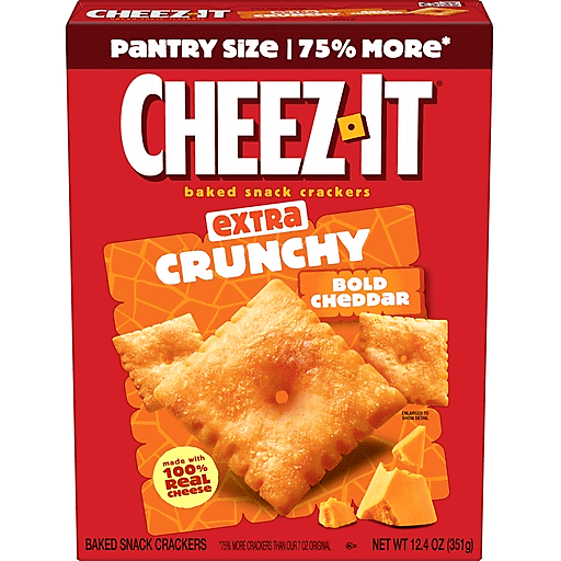 Outrageously cheesy and ridiculously craveable, Cheez-It Extra Crunchy baked snack crackers are deliciously crunchy little crackers that have captured cheese-lovers for decades. Discover a crowd-favorite snack made with 100% real cheese baked to extra crunchy perfection for an irresistible taste in every bite. Each lightly salted cracker is loaded with a burst of bold cheddar flavor; Cheez-It baked snack crackers are a fan-favorite for game night, school snacks, family movie nights, party spreads, late-night snacking, and so much more, the cheesy options are endless. Delicious for all ages, grab a box of Cheez-It Extra Crunchy crackers for every family snacking moment. Whether you're packing them in school lunches, grabbing some for the office, or taking along on a road trip, you'll find a delicious, crisp snack that is filled with big cheese flavor. It’s no wonder that these bite-sized crackers have become a crowd-favorite, bringing smiles and that urge for just one more handful.