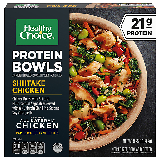 Boost your day with Healthy Choice Protein Bowls Shiitake Chicken. Each Healthy Choice frozen entree is a delicious way to get a reliable source of fiber and protein to help you power through your day. This high-protein frozen meal features pulled all-natural¹ chicken (raised without antibiotics), shiitake mushrooms, and mixed vegetables served with a multigrain blend in a sesame soy vinaigrette, perfect for a nourishing meal to fuel your body. A delicious way to keep you feeling satisfied, this power bowl frozen meal provides 32% of your daily protein with 21 grams per serving and 18% of your daily dietary fiber with 5 grams per serving and is perfect for a satisfying lunch or quick dinner. Simply microwave this frozen chicken bowl for 4 to 5 minutes and let stand for 1 minute. Keep in the freezer until ready to enjoy. ¹No artificial ingredients. Minimally processed.