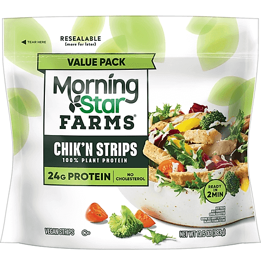 MorningStar Farms chik'n strips are lightly seasoned and a perfect meal starter for a variety of tasty recipes. Combine into your favorite stir-fry, add as a topping to your salad, or spice things up with some added protein to your fajitas. Batter, fry, saute, wrap, or toss these yummy meatless chicken strips into any meal. The possibilities are endless; These veggie strips provide an excellent source of protein (31% daily value) and are cholesterol free (contains 0.5g monounsaturated fat and 1.5g polyunsaturated fat per serving). MorningStar Farms chik'n strips are easy to prepare in the microwave or in the skillet. The resealable bag makes it easy to store in the freezer and use again when you're hungry for a quick lunch or dinner. Add your own seasonings for an extra kick of flavor. Sharing a meal with friends or enjoying a special occasion with loved ones, MorningStar Farms chik'n strips are sure to delight vegans, vegetarians, and meat-lovers alike.