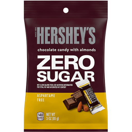 There's happy, and then there's HERSHEY'S happy. Made of the delicious chocolate candy that's been a classic for decades, HERSHEY'S Zero Sugar chocolate candy with almonds bars make life more delectable even with dietary restrictions. These sugar free candies are the perfect treat for countless special and everyday occasions. HERSHEY'S Zero Sugar chocolate candy with almonds bars can be used to stuff festive Christmas stockings, Halloween trick or treat bags, springtime Easter baskets and sweet Valentine's Day party favors. Keep a bag on hand for guests and store some in your pantry for convenient snacking when the mood strikes. HERSHEY'S Zero Sugar chocolate candy with almonds bars are aspartame free and kosher certified. Show up to movie night with sugar free HERSHEY'S bars for a sweet treat that will please the whole crowd, including those with low and no sugar diets. You can even deck out your favorite sugarless baked desserts with these chocolate candy with almonds bars by topping cupcakes, brownies and cookies with a section or two. Everyone is excited when they're reaching for sugar free HERSHEY'S almond chocolate candy, and now you can be, too. Just don't forget to save a few individually wrapped bars for yourself during all of that sharing!