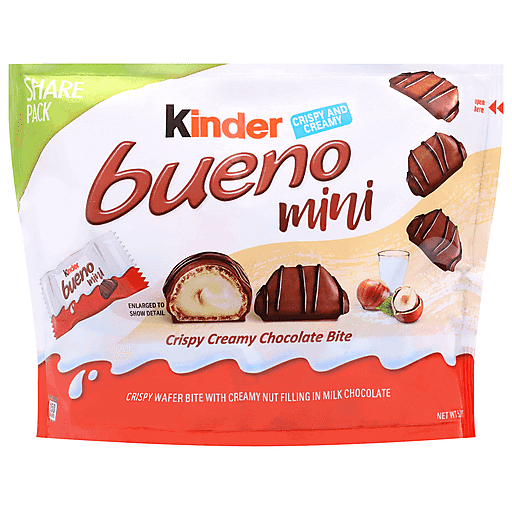 Discover the unique and exceptional taste of Kinder Bueno Mini in this bag of bite sized chocolates. This share size bag contains 5.7 ounces of Kinder Bueno Mini chocolate bars. Smooth milk chocolate, creamy hazelnut filling and a crispy wafer deliver sensational taste with every bite. Make an ordinary moment extraordinary by adding the crispy, creamy deliciousness of a Kinder Bueno Mini milk chocolate bars to your coffee moment or movie night. These mini bars are perfect for enjoying with a friend. You can also make your desserts and baked goods more delicious by topping them with Kinder Bueno Mini.