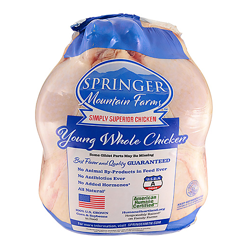 Springer Mountain Farms Whole Chickens are hand selected at the optimum size for baking so they come out tender, juicy and flavorful every time. Each one is individually wrapped and sealed, and contains giblet parts.