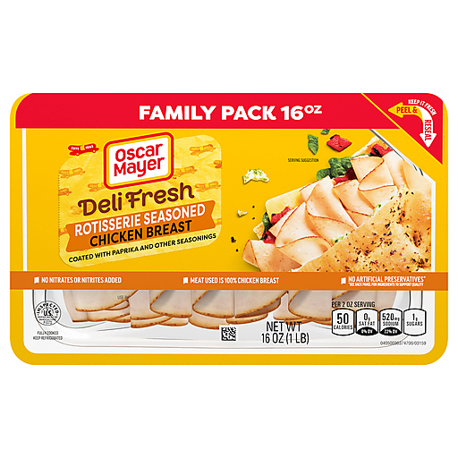 Skip the deli line and enjoy the sliced chicken breast you know, love and trust. Oscar Mayer Deli Fresh Rotisserie Seasoned Chicken Breast delivers the flavorful slices you crave, coated with paprika and other seasonings. Chicken breast slices are fully cooked and ready to enjoy. Made with no artificial preservatives and no nitrites or nitrates added, each serving of rotisserie seasoned chicken breast slices contains 8 grams of protein (see ingredient line for ingredients to support quality). Our Peel and Reseal feature ensures maximum freshness, thanks to our fully resealable lid that keeps every slice as delicious as the first. Whether you're stacking a sandwich, adding protein to your salad, crafting a charcuterie board or snacking straight from the fridge, you can count on the resealable packaging to lock in freshness after every use. Each 16-ounce family size pack of sliced chicken breast contains 8 servings. Keep it Oscar and enjoy deli-style chicken breast at home.