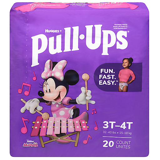 Start potty training with Pull-Ups Training Pants for Girls! Each training underwear delivers easy changes with refastenable sides, allowing you to keep pants and shoes on your toddler. Pull-Ups Potty Training Pants feature up to 100% leak-free protection and targeted absorbency where girls need it most. Made with soft and breathable materials, these girls’ training pants are comfy and flexible, with an underwear-like fit to help make potty training easy. Not only do they provide all-around coverage, but they also are designed for little hands to easily pull up and down for Big Kid independence. Each pack includes two exclusive music designs featuring Disney's Minnie Mouse, with instrument graphics that fade when wet to help motivate your child to stay dry. Making music with Minnie Mouse comes to life with interactive digital tools. When your child is ready to begin her potty training journey, the Pull-Ups brand can help. Visit the Pull-Ups website for expert potty training tips and resources. We've helped train 60 million Big Kids and counting!* Pull-Ups Girls' Training Underwear are available in sizes 2T-3T (16-34 lbs), 3T-4T (32-40 lbs), 4T-5T (38-50 lbs) and 5T-6T (50+ lbs). (*US and CA)