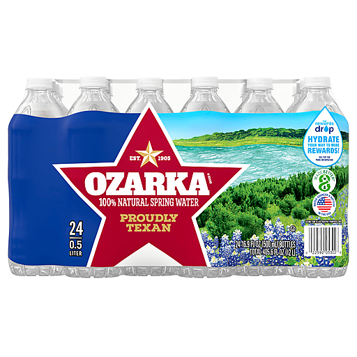 Get back to nature with Ozarka Brand 100% natural spring water. Carefully sourced from three natural springs located in the great state of Texas, it contains naturally occurring electrolytes for a crisp, clean taste you'll love. And with a better bottle made with 100% recycled plastic* and 100% recyclable, you know that you're not just getting the best that nature has to offer, you're doing your best to help us conserve it too. So grab a pack and get ready for whatever fuels you. Ozarka water is available in a variety of sizes, so you can easily stay hydrated no matter where you are. From your gym bag to your hiking pack, on the go or at home, you can pick up the perfect size for wherever your life takes you. Stock the fridge so your family always has crisp, refreshing hydration on hand. Plus, the more you drink, the more you can earn with The Rewards Drop. Get points with every purchase toward event tickets, merchandise and more – see packaging for details. It's one more reason to enjoy the big, crisp, refreshing taste that's been making Texas proud since 1905. *20 oz, 700mL, 1L, 1.5L still water bottles only. Excludes label and cap.