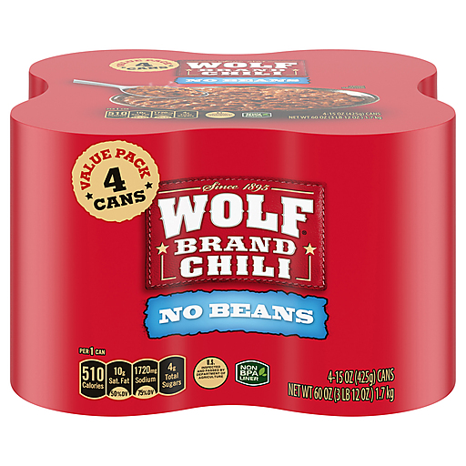 Order a 4-pack of WOLF BRAND Chili No Beans in 15-ounce cans to help quickly put together a feast. The original, authentic Texas recipe dates back to 1895. This canned chili is filled with hearty beef and pork simmered in tomato puree with a blend of bold spices. Serve up this delicious canned chili with toppings, such as shredded cheese, corn chips, sour cream and crackers, or pour it over baked potatoes or nachos. WOLF BRAND Canned Chili Without Beans is made with beef and pork and has no preservatives. Best of all, it's easy to heat it up on the stovetop, in the microwave or even in a slow cooker for a quick meal. WOLF BRAND Chili No Beans is your go-to choice for a bold, thick and hearty chili.