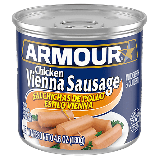 Armour Star Chicken Vienna Canned Sausage offers ready to eat sausage with great flavor. The Vienna sausages are made with chicken in chicken broth. This chicken sausage can be eaten right out of the can, so you can enjoy this canned food as a ready to eat snack. Use the chicken sausages to dress up appetizers, top pizzas, add flavor to stews or elevate pasta dishes.
