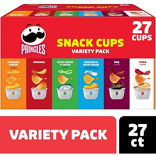 A burst of crisp, crunchy potato goodness seasoned to salty perfection. This variety pack includes six fan-favorite Pringles flavors - from classic Original to bold BBQ and savory Cheddar Cheese - so there’s something for everyone. Pringles potato crisps are ingeniously shaped, crisp and light, but never greasy. Each crisp chip delivers that signature crunch and craveable flavor in every bite. With convenient, portable snack cups, it’s easy to enjoy your favorite Pringles wherever life takes you. Grab one as a pick-me-up for after school or pack as the ultimate car snack for road trips. Bring these snacks to game time and pack a few for other Pringles fans. Stash this snack in your work desk or pantry to enjoy anytime. Share Pringles at your next cookout or BBQ to turn up the flavor and fun among family and friends. Get your hands on Pringles potato crisps chips for an irresistible taste experience that keeps you coming back, stack after stack.