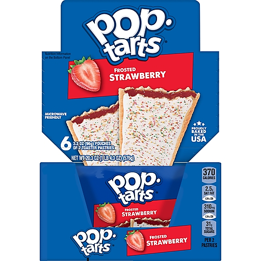 Pop-Tarts toaster pastries are the perfect sweet treat at breakfast, for a lunch snack, or dessert. Featuring a sweet Frosted Strawberry filling and crunchy sprinkles in a soft pastry crust, this ready to eat treat is perfect for kids snacks and adult snacks on the go. Pack Pop-Tarts Frosted Strawberry in kids lunchboxes for school snacks, or stock the office pantry with this individually wrapped grab and go adult snack. Pop them in the toaster and pair with milk, create your own ice cream sandwiches, or incorporate into your favorite dessert recipe for a sweet treat. These irresistible snacks for adults and kids provide a good source of three B vitamins. Stock your pantry with these shelf stable snacks and enjoy ready to eat treats anytime. A flavor for everyone, including beloved classics like Frosted Blueberry or Frosted Cherry, or our more indulgent flavors, Frosted Cookies and Creme or Frosted Chocolate Fudge.