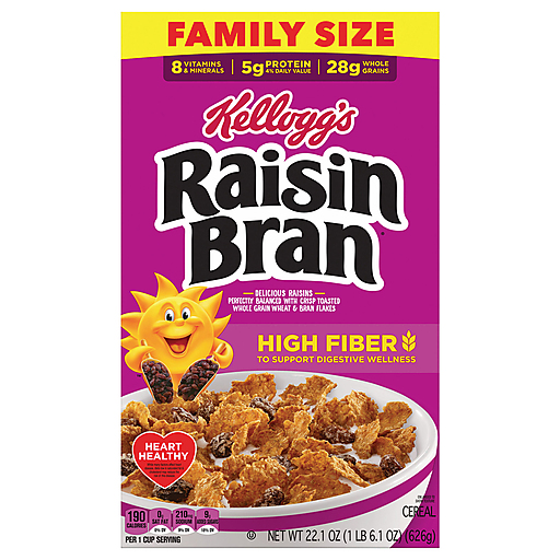Wake up with Sunny and the delicious taste of Kellogg's Raisin Bran, a delicately crafted cereal that helps bring energy to start your day. This crunchy, healthy cereal is made with crispy, toasted whole grain wheat and bran flakes balanced with the satisfying taste of sweet sun-ripened raisins in every spoonful; Just as nutritious as it is delicious, this breakfast cereal is heart-healthy (while many factors affect heart disease, diets low in saturated fat and cholesterol may reduce the risk of this disease). Kellogg's Raisin Bran cereal provides 26% of your daily value of fiber and is a good source of 8 vitamins and minerals to help you start your day off strong. This crunchy cereal is bursting with delicious, so you can enjoy our best in every bite. Whether you prefer your Kellogg's Raisin Bran in a bowl with your favorite milk for a quick breakfast, sprinkled over yogurt for an afternoon treat, or as a crispy snack straight from the box, Kellogg's Raisin Bran cereal lets you make the most of your day.