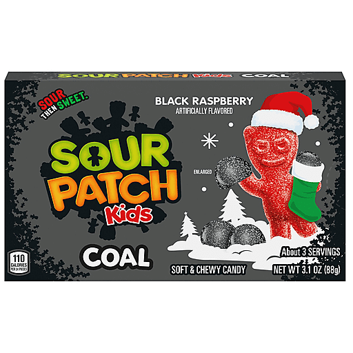 Spread a little mischievous holiday cheer with SOUR PATCH KIDS Coal Black Raspberry Soft & Chewy Holiday Candy. This Christmas coal candy is a fun stocking stuffer for those on your naughty and nice list, this sour candy has intense black raspberry flavor for a blast to your taste buds that's SOUR. SWEET. GONE. This coal-shaped SOUR THEN SWEET candy is a great holiday candy for families, coworkers and friends. SOUR PATCH KIDS coal candy is a must-have item for your list of holiday party favors, holiday party supplies and stocking stuffer ideas. These SOUR PATCH KIDS sour gummy snacks are easy holiday treats for enjoying while putting up holiday decor, wrapping Christmas gifts, or watching your favorite Christmas flick. Packaged in a holiday-themed movie theater-style candy box, this chewy candy is the perfect size for stocking stuffer candy and for stashing in purses and backpacks.