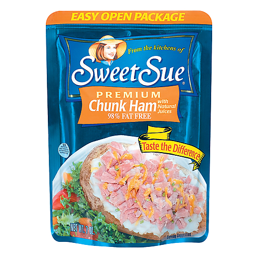 Premium chunk ham with natural juices. 98% fat free. From the kitchens of Sweet Sue. The kitchens of Sweet Sue continue our tradition of delicious, homestyle recipes with our Premium Chunk Ham Pouch. The pouch eliminates the hassle and mess of cooking an entire ham, and at the same time, provides a great-tasting premium ham. Just open and use as a topping or in any of your favorite recipes. Taste the difference! Ham has a firm texture and fresh taste. Fully cooked. Ham is ready to use straight from the foil pouch. U.S. inspected and passed by Department of Agriculture. Questions or comments? 800-633-3294. Easy open package. The kitchens of sweet sue continue our tradition of delicious, homestyle recipes with our premium chunk ham pouch. The pouch eliminates the hassle and mess of cooking an entire ham, and at the same time, provides a great-tasting premium ham. Just open and use as a topping or in any of your favorite recipes. Taste the difference!