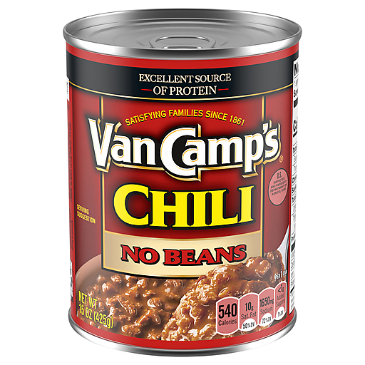 VAN CAMP'S has been making delicious beans for more than 140 years. If you love the taste of VAN CAMP'S beans, but prefer your chili the traditional way, try VAN CAMP'S Chili No Beans. The same hearty helping of beef and pork are simmered in vine-ripened tomatoes and a special blend of spices for a delicious dish your whole family will love. This easy chili without beans tastes delicious on its own or use it as a topping for baked potatoes or mix it into queso for a hearty dip. VAN CAMP'S Chili is an excellent source of protein with all-natural* beef and pork with no preservatives. Quickly heat up on the stovetop or in the microwave for an easy weeknight dish.